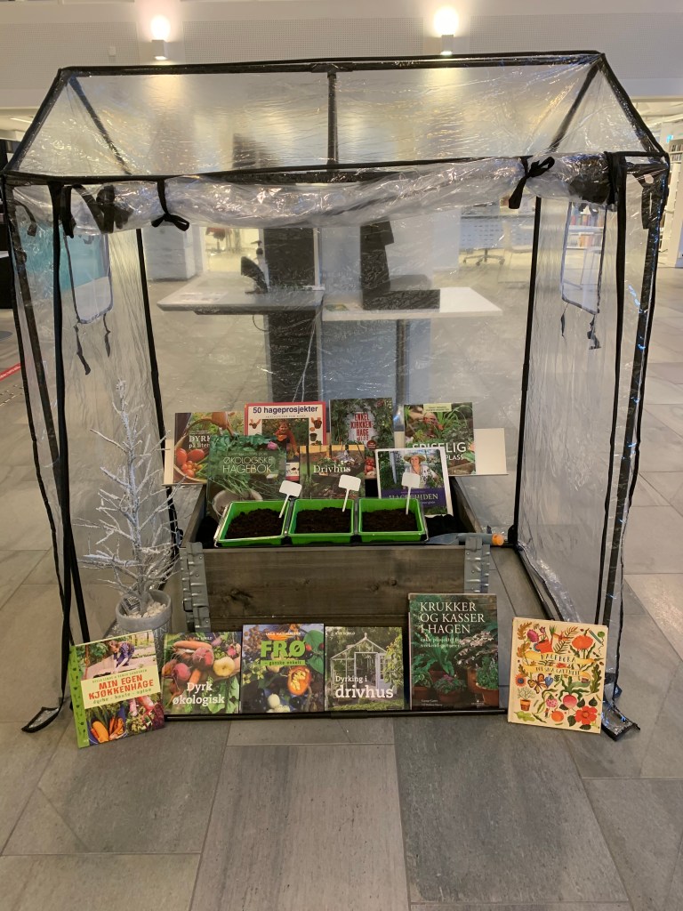 I dag har jeg hatt med meg mitt lille minidrivhus som vi har satt sammen i tillegg til pallekarmer. Jeg har også plantet prydbønner, tomater og erteblomster. Veldig gøy å få inspirere de som er innom biblioteket. Mange har stoppet og hatt flere spørsmål i dag. Utrolig gøy med slike oppgaver i løpet av en arbeidsdag.
