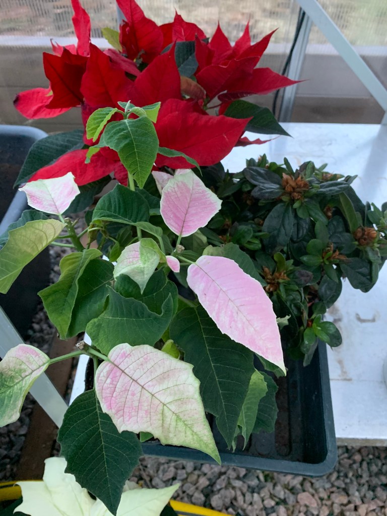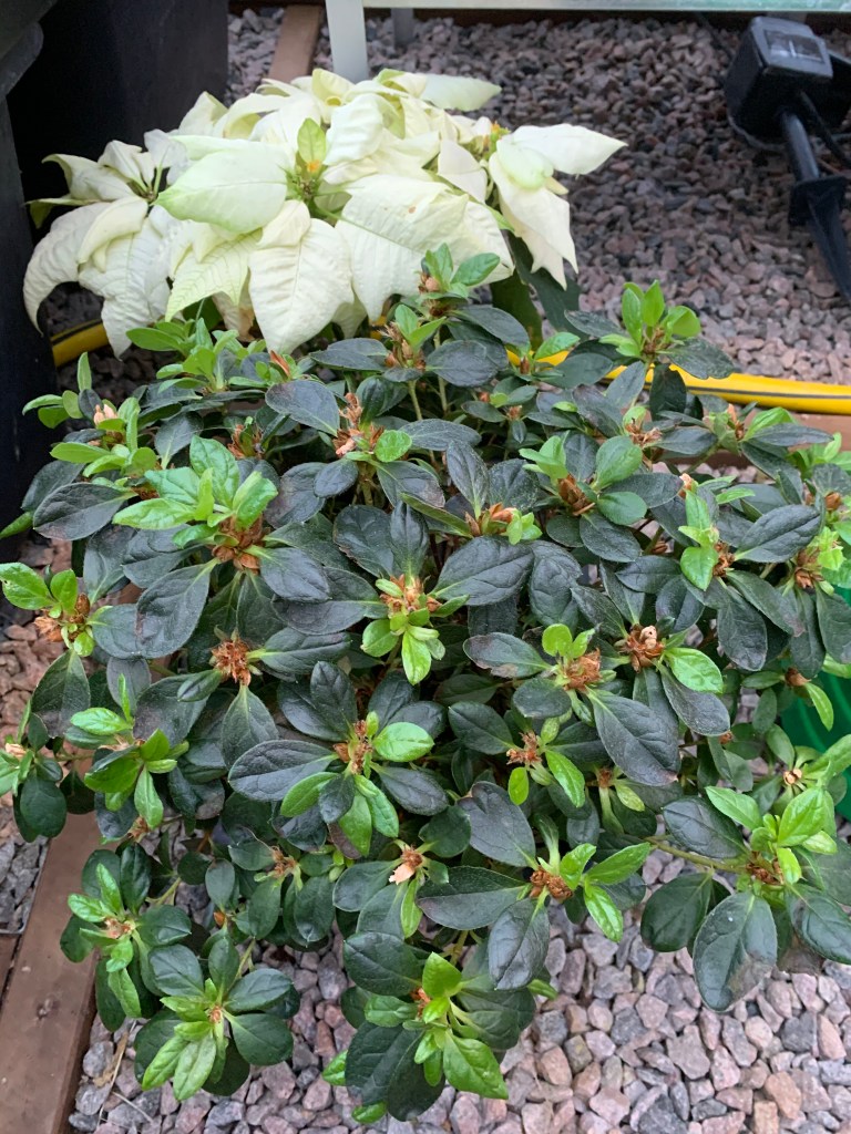 En stor asalea med masse nye skudd og en hvit julestjerne. I fjor plantet jeg asaleaene i større potter. De vokser masse og tidlig høst kommer det blomster. Julestjernene vokste også veldig da de fikk større potter.