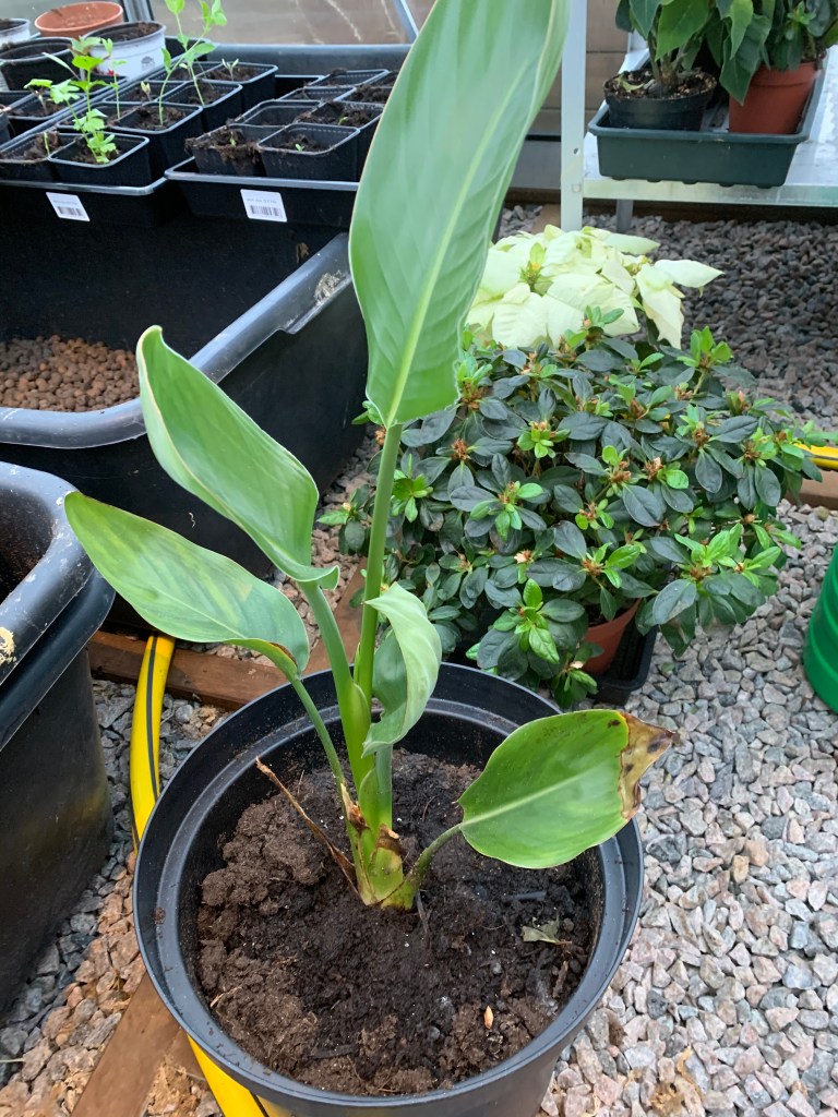 Jeg har også satt ut asaleaene, julestjerner og papegøyeblomst (strelitzia). Streliziaen kjøpte jeg på Zimtrade i fjor og jeg var usikker på om den ville overleve inne. Jeg satte den i en stor potte og den har stått i stua gjennom vinteren. Har klarte seg kjempefint. Spennende å se i år om jeg kan få blomster på den.